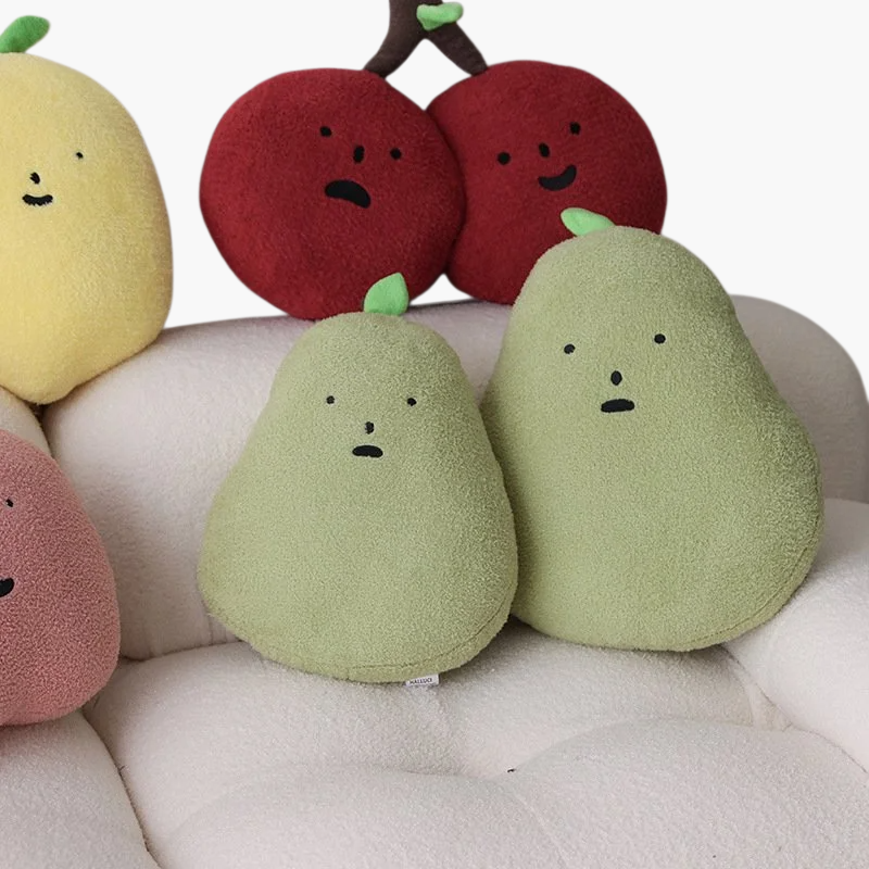 귀여운 과일 디자인, 부드러운 촉감, 통기성 좋은 소재, 다양한 크기 선택 가능, 인테리어 소품 및 선물용 추천, 세탁 가능.